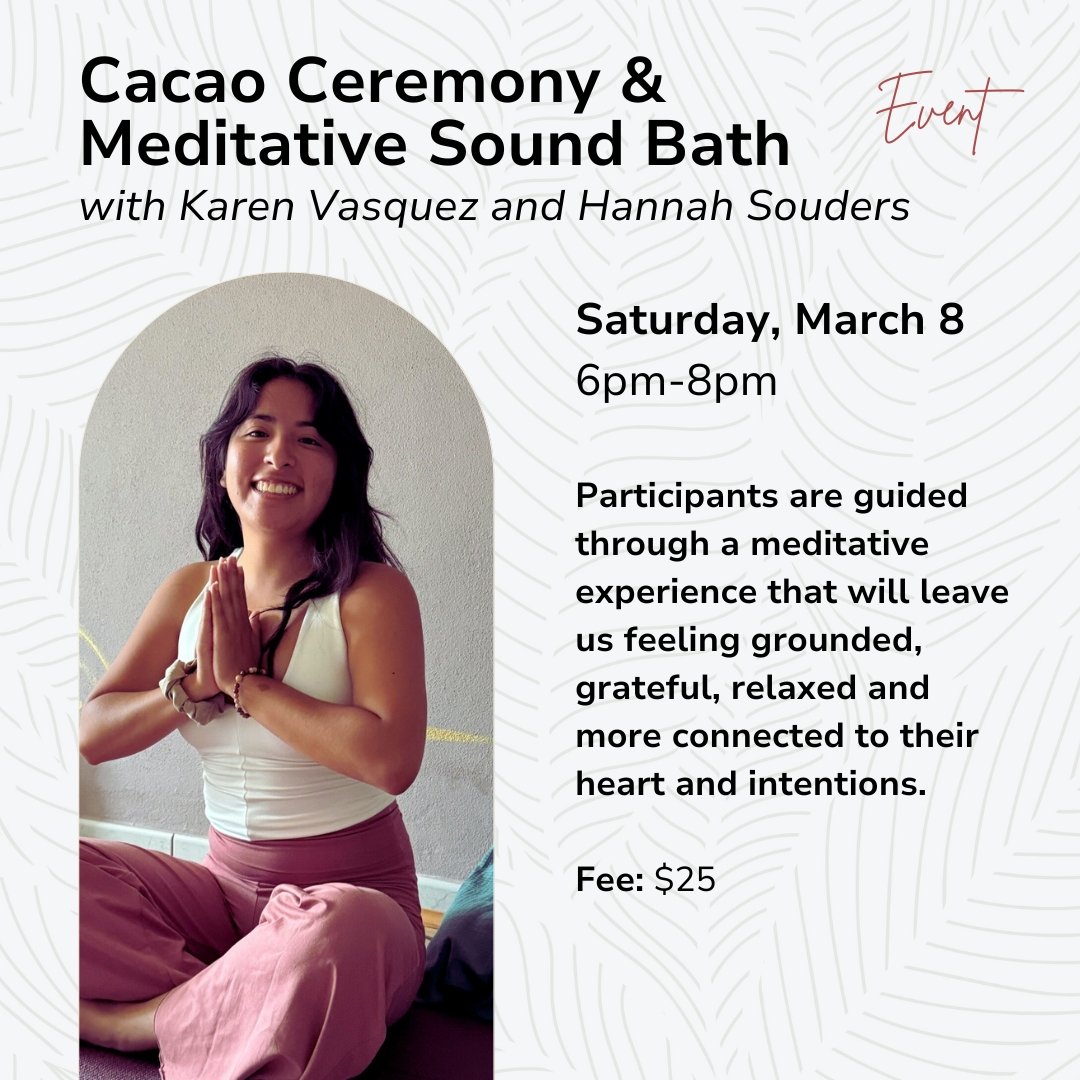 Join us for another ceremonial cacao ceremony and a sacred sound bath with Karen Vasquez and Hannah Souders.