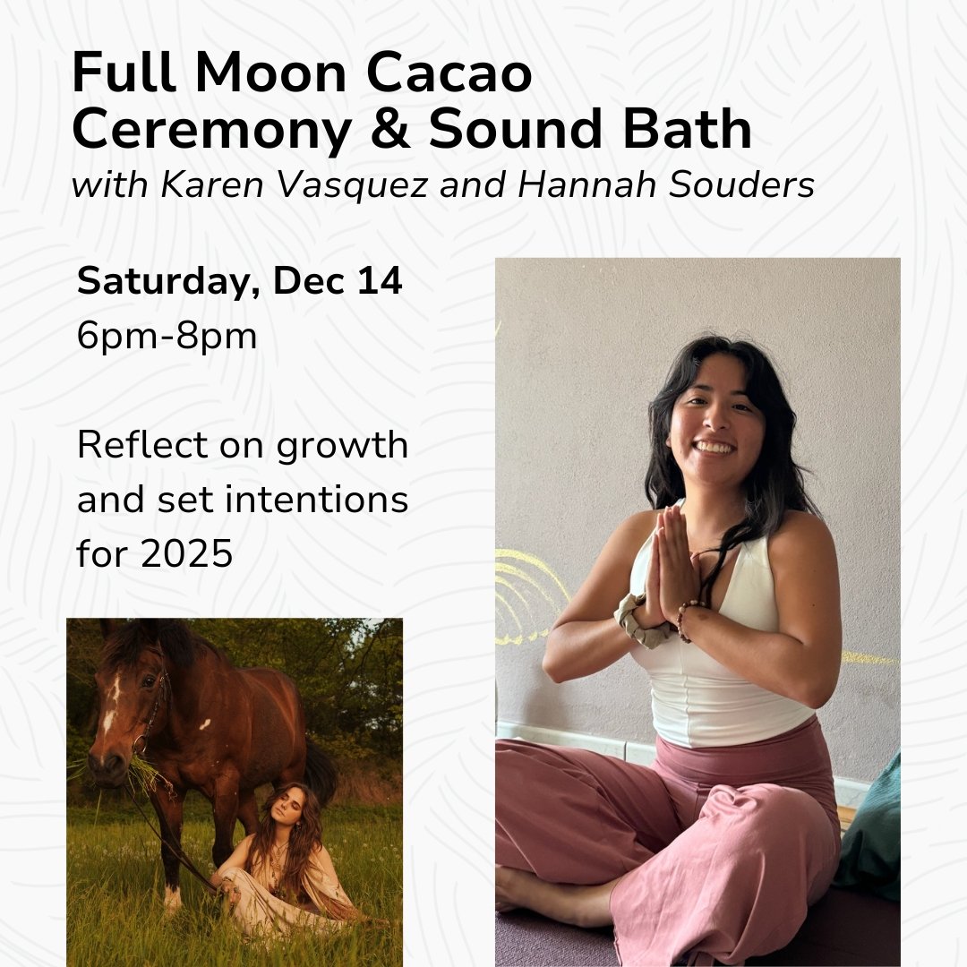 Join us for an evening under the last super full moon of the year with ceremonial cacao and a sacred sound bath with Karen Vasquez and Hannah Souders. This ceremony will grant us the opportunity to review the last year, celebrate our wins, reflect on our growth, and set intentions for 2025!